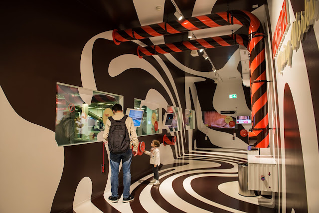 Помимо интерьера и концептуального дизайна музея есть ещё несколько отличий с "коллегой" из люцерна. Во-первых, а я уже писала что это очень важно, здесь не так много шоколада для дегустации. Справедливости ради замечу, что он есть, даже шоколадные фонтаны есть, но их немного, и только в конце "маршрута" по музею. Во-вторых, фабрика Maestrani под Сент-Галленом не просто заворачивает готовый шоколад в обёртки, но и собственно готовит сам шоколад. Фабрика здесь в разы больше, чем Aeschbach в Люцерне, и производство шоколада здесь самое что ни есть полноценное - от порошка какао до упакованых в пластиковые ведёрка наборов шоколадных конфет в форме лесных животных. Очень интересно! Опять же, везде прозрачные стёкла и полно неожиданной информации на стэндах. Например, 3/4 выращиваемых лесных орехов употребляются людьми не сырыми, а в шоколадках. Или ещё: в Швейцарии в шоколадной индустрии работает около 4000 человек. Мне казалось намного больше.